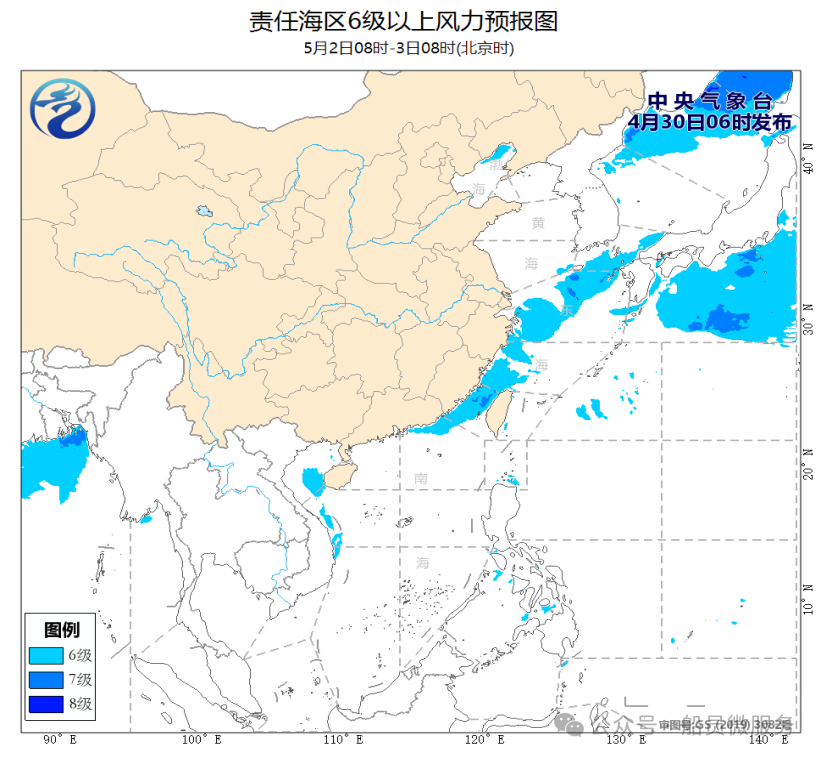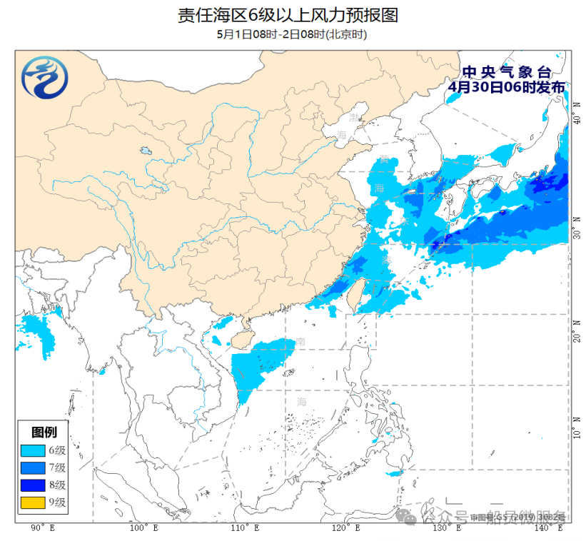 预计,4月30日白天至5月1日夜间,黄海大部海域、东海大部海域、台湾海峡、台湾以东洋面、南海北部和中西部海域、北部湾将有6~7级、阵风8级的风,其中30日白天至夜间东海部分海域的风力可达8~9级、阵风10级。5月2日白天至夜间,东海大部海域、台湾海峡、北部湾、南海东北部海域将有6~7级的风。 + [! E: W9 u5 T/ s" s$ u2 O