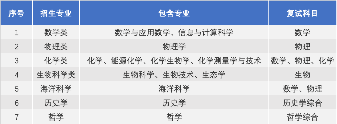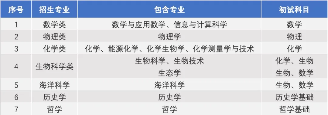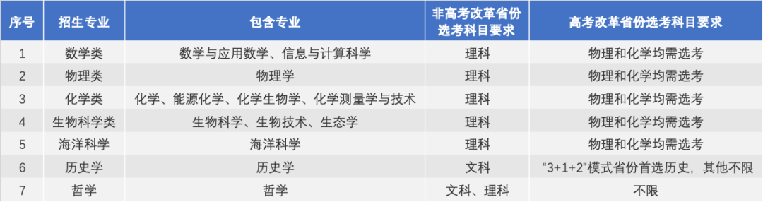 2024年厦门大学强基计划招生专业包括数学类、物理学、化学类、生物科学、海洋科学、哲学、历史学。其中生态学、海洋科学为今年新增专业,均为厦大双一流学科。