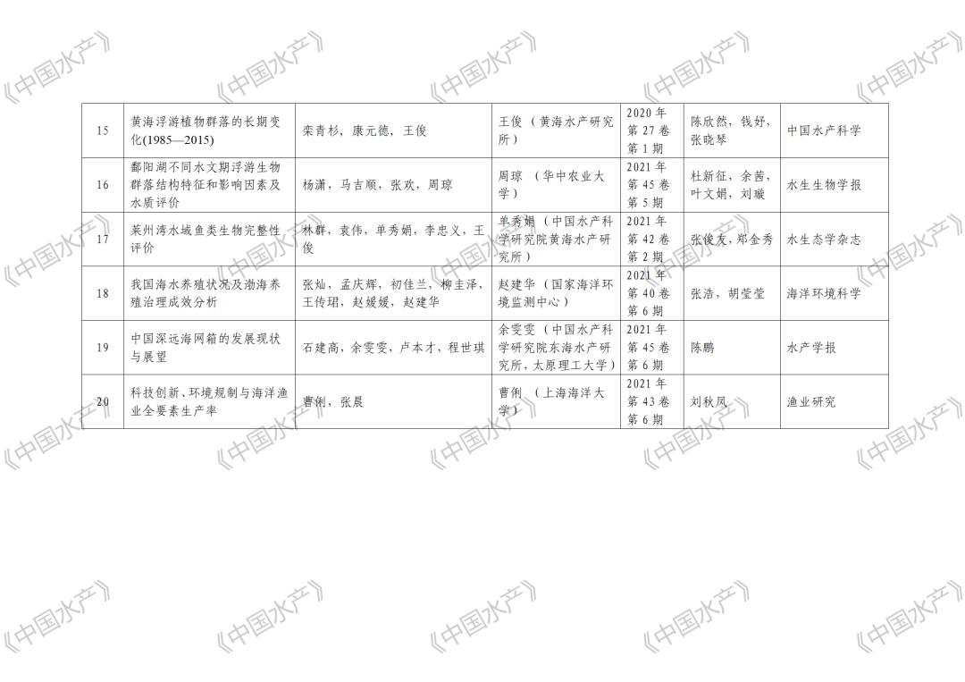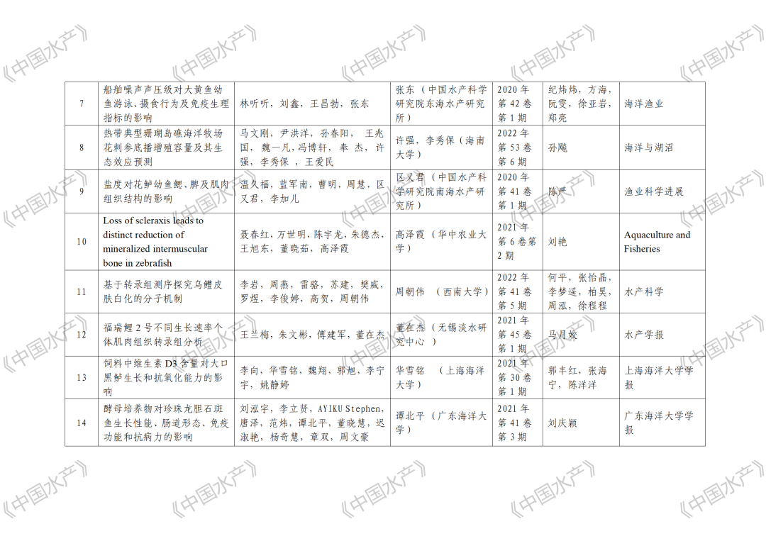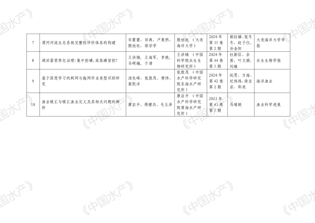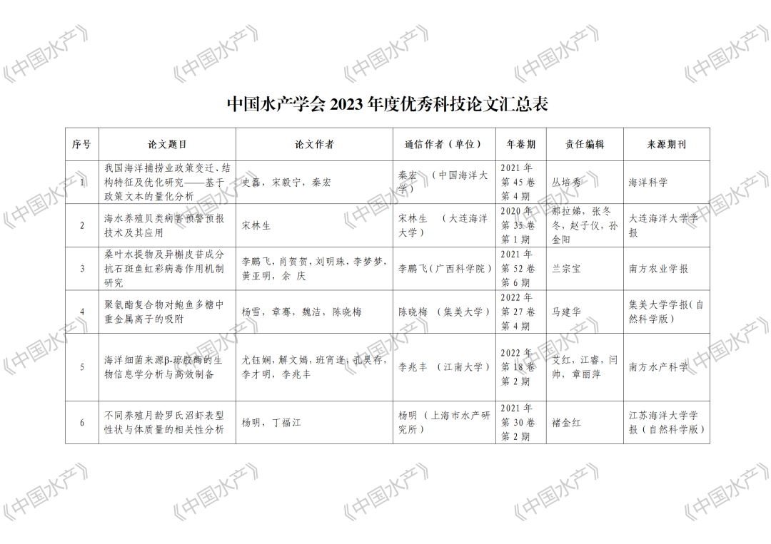 ; L1 v4 Q4 r. [# G8 @; i/ m 引 言 为贯彻落实《中国科协 中宣部 教育部 科技部关于深化改革 培育世界一流科技期刊的意见》(科协发学字〔2019〕38号),推动中国水产学会“世界一流水产科技期刊”品牌建设,鼓励更多高水平水产领域科技成果在国内期刊首发,推动我国水产类科技期刊高质量发展,根据《中国水产学会年度优秀科技论文遴选办法》(农渔学〔2021〕23号)有关规定,中国水产学会组织开展了中国水产学会2023年度科技论文遴选工作,经形式审查、学科同行评审、评审委员会终审、评审结果公示、学会常务理事会审定,共评选出中国水产学会2023年度最佳科技论文10篇、优秀科技论文20篇。名单如下: ( G" L2 W1 H, F* [7 |