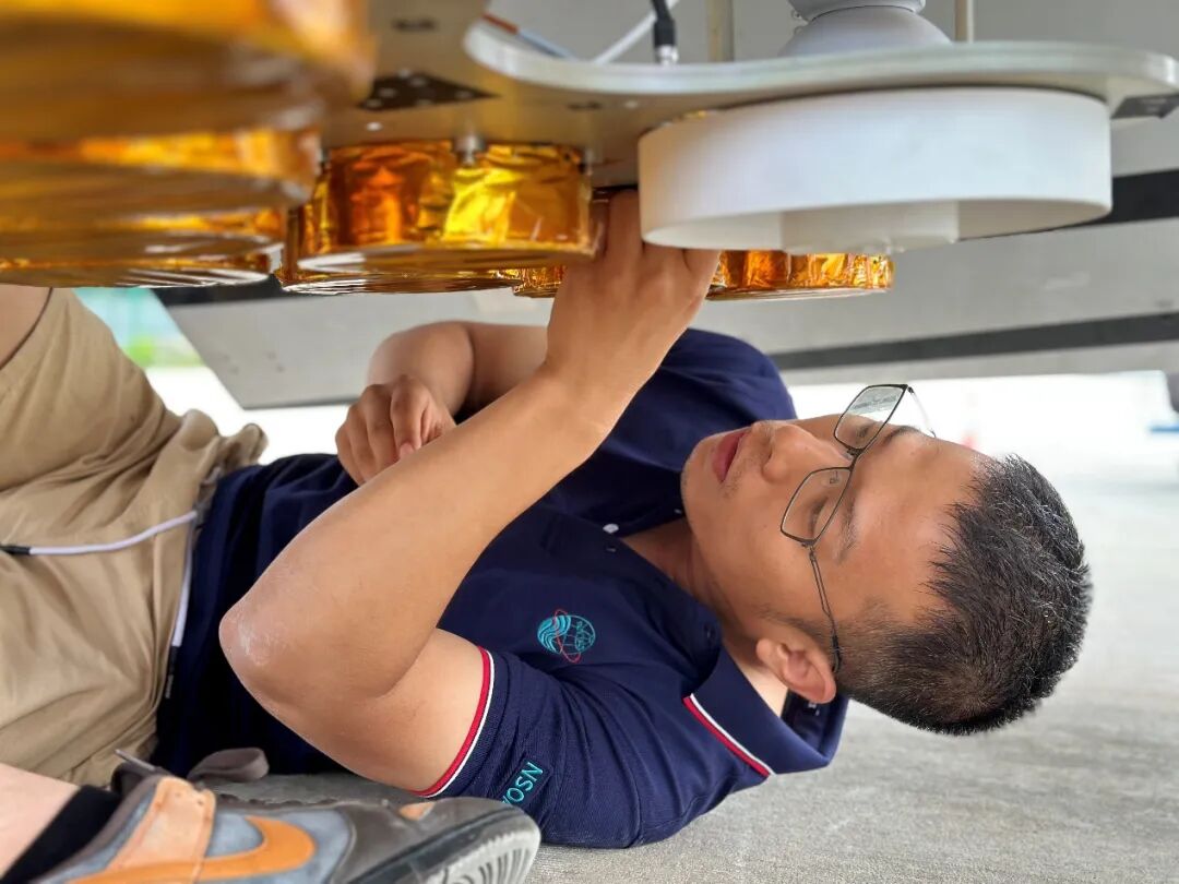 % H9 {, W2 P, {4 c" D2 z 7月6日,综合孔径辐射计校飞载荷抵达烟台,在黄东海光学遥感海上检验场的海上平台进行海面观测测试。在航空校飞试验中,2架飞机将在不同高度,前后依次排列飞行(一前一后,一高一低),绕飞黄东海光学遥感海上检验场海域进行观测。在另一处试验海域——莱州湾,试验团队采用5艘试验船作为海上观测平台,分别配备温盐深仪和气象站测量海表温度、海水盐度、海面风速和风向、气温和相对湿度等设备。航空校飞同步观测时,5艘试验船沿海表盐度梯度方向排列,同步测量航空观测海域的海洋环境数据。地面人员根据校飞试验搭载的机载系统参数以及飞行姿态参数等,搭建适用于盐度星校飞样机的全链路仿真,完成从海面场景参数到机载系统测量模拟,最后到海面参数反演的全链路仿真。 G% P' h% w$ U _7 Z- ^