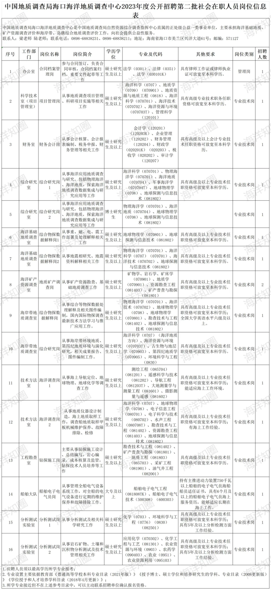 中国地质调查局海口海洋地质调查中心(以下简称“海口中心”)是中国地质调查局自然资源综合调查指挥中心(以下简称“指挥中心”)直属的正处级公益一类事业单位,主要承担海洋基础地质、矿产资源调查评价和海岸带、岛礁自然资源调查监测评价工作,向社会提供公益性服务。根据事业发展需要,2023年面向社会招聘在职人员若干名,有关事宜公告如下: ; Y2 u( p7 @" I* {/ N! I2 R