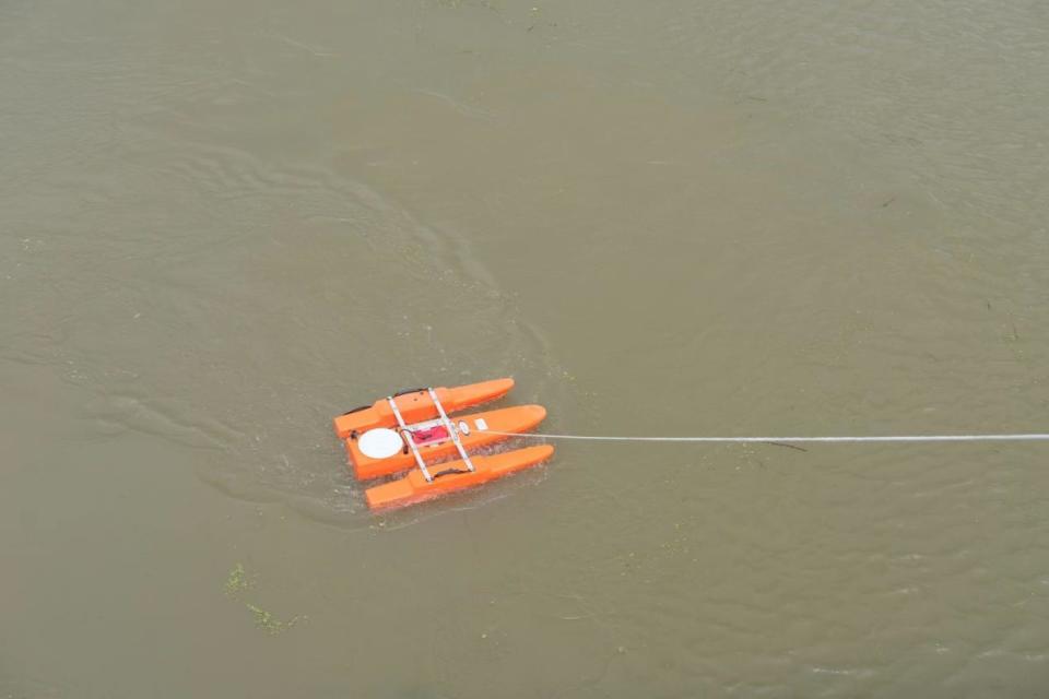 8月5日15时,静海区民生村革命桥,天津水文工作人员实时监测桥下水流强度,已达500立方米/秒。
