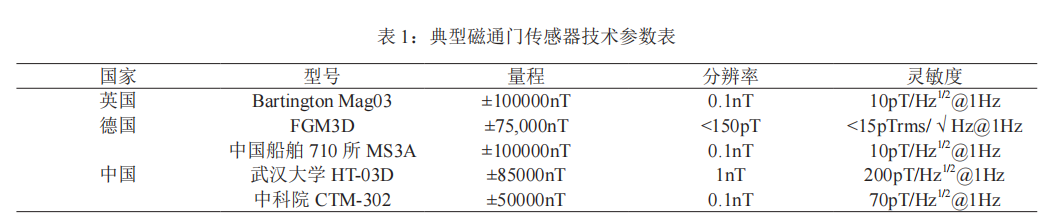 % m; R1 C8 ^4 g: F/ X) n$ T. d 3.1 磁通门传感器 磁通门传感器是基于软磁材料的非线性磁化特性,利用具有高磁导率的磁芯在外磁场作用下的电磁感应现象测定外界磁场的仪器,主要由磁通门探头、信号激励电路和信号提取电路构成。磁通门传感器最早研制于二战时期飞机反潜领域,战争结束之后被广泛应用于未爆弹探测、海洋磁测、矿产勘探等领域 [7]。磁通门传感器是利用高磁导率、低矫顽力软磁材料的磁饱和特性制造的磁强计。基于磁调制原理,在交变磁场激励下,磁芯处于周期性过饱和状态,可根据被测磁场中的磁芯的磁感应强度与被测磁场的磁场强度非线性对应关系测量磁场。该方法可测量恒定或缓慢变化磁场,适用于空间弱磁场的矢量检测 [8]。磁通门传感器原理是利用磁通门探头,基于聚磁效应将外界磁场信号转换为电信号,再经过 LC 谐振、前置放大、选频放大、相敏整流和积分环节输出稳定的磁电信号,并通过反馈环节形成闭环,构成稳定磁通门传感器系统 [9]。磁通门探头有单磁芯探头、双磁芯探头和环形磁芯探头等形式,为了输出高灵敏度的磁场信号,并使得传感器体积足够小,本项目采用双磁性探头的结构,双磁芯探头由激励线圈、感应线圈和磁芯构成。磁通门探头的输出信号十分微弱,而且含有很大的噪声信号。所以要通过前置放大电路和滤波电路来增强电路的信噪比。磁通门电路必须具备相敏特性,使输出信号表征被测磁场的极性。相敏检波的输出信号经过滤波电路后得到平滑的脉动信号,在闭环控制系统中为了提高前向通道的增益还必须设置积分器。这样经过积分器后的信号通过反馈电路接到磁通门传感器探头的输出端。最终,积分器的输出端得到正比于外界磁场的直流信号。如表 1 所示,国外典型的磁通门传感器还有英国巴廷顿公司的 MAG 系列、德国 FGM3D 型磁通门传感器,美国TFM65 型通门传感器,美国 Bell-3030 型磁通门传感器等。国内较先进的磁通门传感器有中国船舶集团第七一〇研究所研制的 MS3A 型磁通门传感器、中国科学院地球物理研究所研制的 CTM-302 型三分量磁通门传感器等。