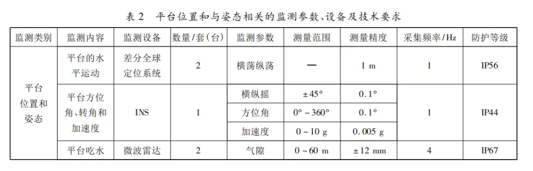 3 c; p. u% q! l: C5 L! ~, @ 平台位置和姿态监测系统监测的内容主要包括平台6个自由度的运动和加速度、平台吃水和上部甲板气隙。平台的位置可通过定位系统准确测量;平台的水平运动(横荡和纵荡)可通过定位系统监测值计算得到;平台的方位角(艏向)和倾斜角(纵摇和横摇)可通过惯性导航系统(INS)测量。平台位置和与姿态相关的监测参数、设备及技术要求等见表2。