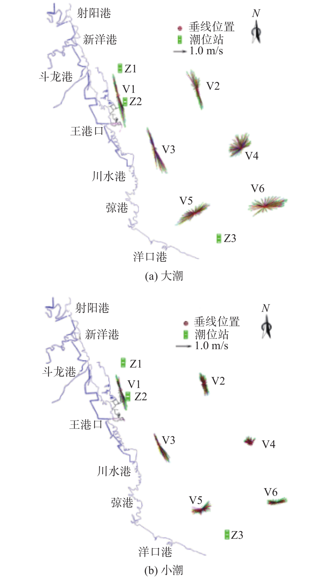 通过潮位分析可见该区域潮汐性质属正规半日潮,潮波传播方向为西北偏北-东南偏南方向,即为南北向为主。本次水下基础检测外业为小潮至中潮期间施测,测量过程平均涨潮历时大于平均落潮历时,平均涨潮历时为6h25min,平均落潮历时为5h54min,具备明显往复流特征,且涨落潮平均流速变化不大。