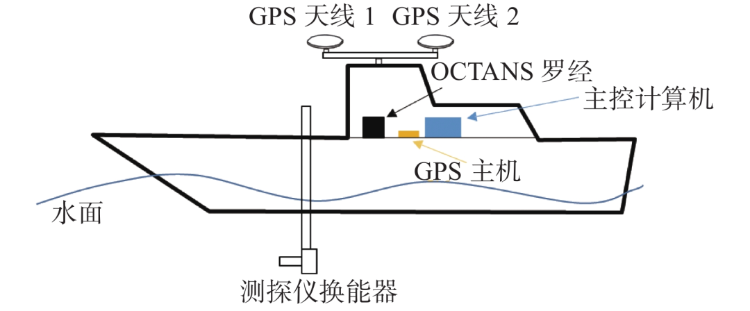 9 w2 V" c( ^& p0 | ^) f4 e 多波束测深系统一般采用舷侧安装方式进行,罗经及运动传感器安装在船只中线上,GNSS采用双天线形式,用以快速定向。量取各分系统之间相对距离,建立以罗经及运动传感器或测深仪安装位置垂线为原点的船坐标系。设备安装如图6所示。