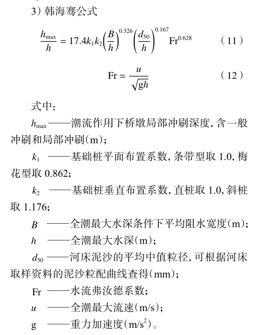 张玮等和祁一鸣等利用现场实测数据和物理模型试验等方法研究了江苏近海风电场桩基局部冲刷深度,通过与实测数据对比,发现采用叠加波浪作用下的韩海骞公式进行局部冲刷深度计算更为合理。