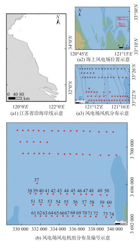 图1南黄海海上风电机组水下基础冲刷实测区域及风电机组分布