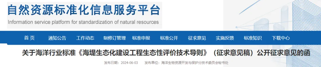 P7 l& F( X# J 海洋行业标准《海堤生态化建设工程生态性评价技术导则》(计划项目编号:202223003)现已完成标准征求意见稿。根据《自然资源标准化管理办法》的有关规定,现公开征求意见。如有意见,请在平台在线填写反馈意见,或将意见以电子邮件形式反馈至海洋生物资源开发与保护分技术委员会秘书处,截止时间为2024年7月2日。 + M4 [3 X9 A; C- l. S6 @