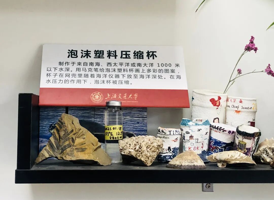 张瑞峰给人这种印象并不奇怪。走进他的办公室,柜子上摆放着几个背包和行李箱,最大最醒目的红色行李包上印着“中国南极科学考察”字样,柜子下横着一辆小单车,有一种随时可以出发的动势;另外还有个陈列柜,陈放着每次出海时张瑞峰用大海制作的小杯子——他每次会把发泡塑料杯放进海里,从这些形状各异的小杯子里,深海强大的压力被凝固下来。