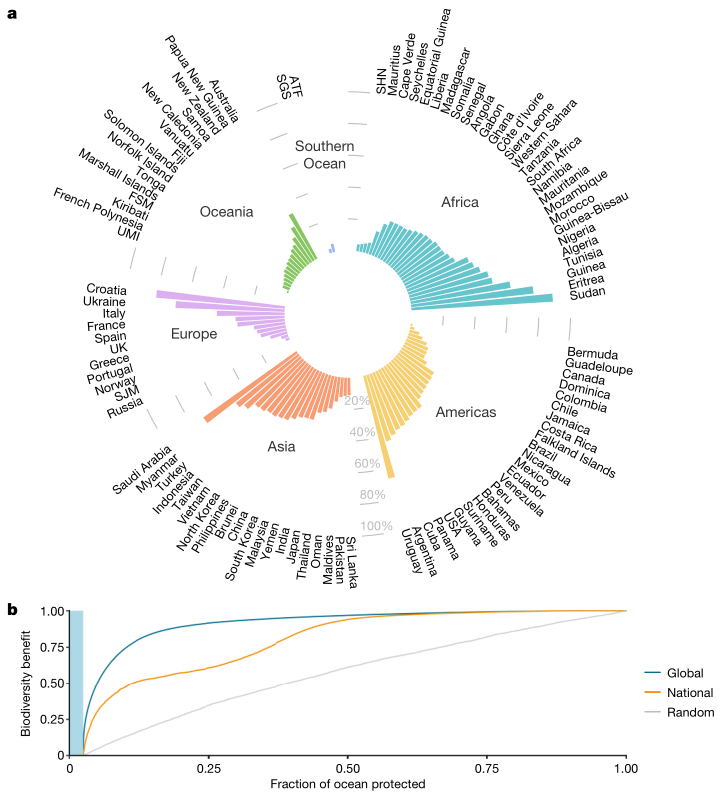 图4 国家对生物多样性保护和协调实施的贡献。a、 在全球海洋生物多样性保护的前10%优先领域中,国家专属经济区所占比例很小。这里显示的是为实现最大可能的生物多样性效益做出最大贡献的100个国家或地区。这些值是电流保护之外的值。b、 根据全球优先事项(蓝色)、国家优先事项(橙色)和随机布局(灰色;100个随机集),通过实施全球协调的MPA扩展,累积生物多样性保护受益。蓝色条表示目前全球海洋的2.7%被纳入全面保护区。ATF,法国南部地区;密克罗尼西亚联邦FSM;SGS、南乔治亚和南桑威奇群岛;SHN、圣赫勒拿、阿森松和特里斯坦达库尼亚;SJM、斯瓦尔巴群岛和扬马延群岛;UMI,美国小离岛。 ( I7 _ q& `6 E