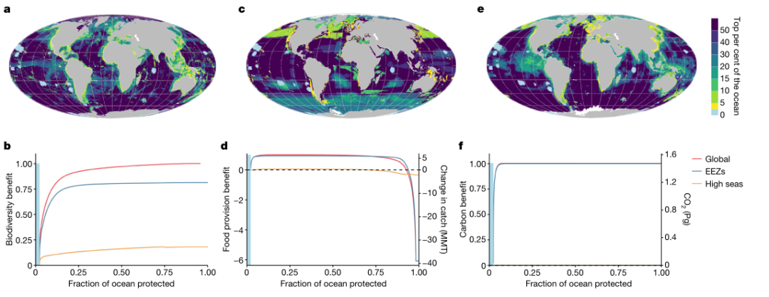 * l/ B; \4 y7 l 图1 全球保护优先事项。a、 c、e、生物多样性保护全球海洋保护区网络的优先次序(a)、粮食供应(c)和碳储存(e)。现有的完全保护区域以浅蓝色显示。b、 d,f,相应的累积效益函数,其中“效益”被定义为养护收益(针对生物多样性)(b)、因海洋保护区溢出而导致的渔业可捕物种净变化(针对食物供应)(d)和因底拖网捕捞而导致的碳扰动风险降低(针对碳)(f)。累积的全球效益和保护公海和专属经济区所产生的效益分别列示。效益曲线中的蓝色条表示目前全球海洋的2.7%被纳入全面保护区。