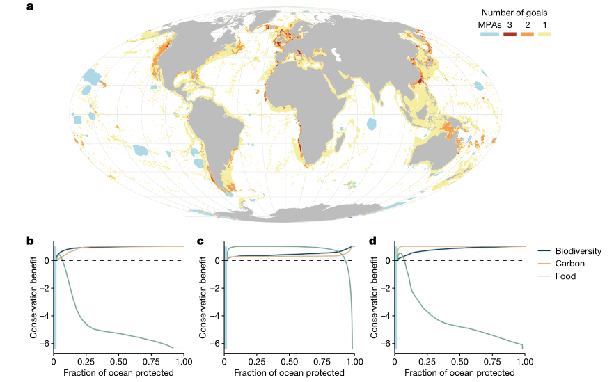 海洋保护区,特别是禁止采掘和破坏活动的高度保护区可以成为有效的管理工具,以保护和恢复海洋生物多样性和相关服务,补充传统渔业管理,并通过保护海洋碳储量为减缓气候变化做出贡献。然而,截至2021年3月,只有约7%的海域被指定或提议为海洋保护区,只有2.7%的海域被实际实施为完全或高度保护区。这种低水平的海洋保护在一定程度上是由感知到的权衡导致的保护和开采之间的冲突造成的。我们不是把保护与开采视为一场游戏,而是询问战略保护规划是否能同时为生物多样性保护、粮食供应和碳储存带来好处。
