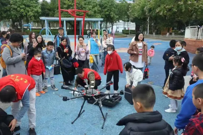 在活动现场,张建霞老师通过讲解,给孩子们科普了测绘技术的内涵及其在我国经济建设与国防建设中的重要作用,邓钟、陈思明、郑守住以及大学生志愿者们向孩子们展示了无人机测绘、卫星测绘、立体摄影测量等先进的测绘仪器装备,并进行现场实操演示,孩子们对测绘技术很感兴趣,非常好奇测绘仪器的测绘原理,在现场参与了无人机航空摄影的全过程。本次活动让孩子及家长们了解了测绘地理信息工作在国民经济和社会发展中基础性和先行性作用,同时也进一步增进了社会公众和广大青少年对测绘地理信息工作的理解与支持。 2 O+ F. N% r5 {/ y9 ]7 r& @