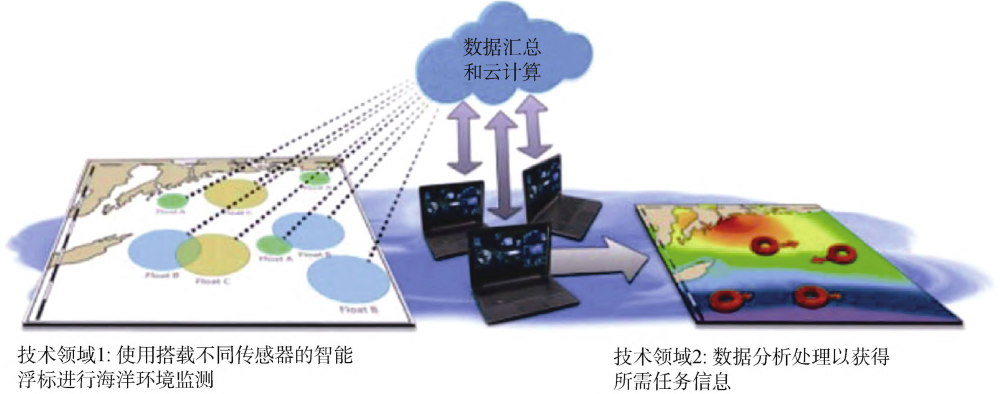 $ \ n+ b; Z+ D) A 由于基于现有技术来连续监测广域海洋的成本是难以负担的,美国国防高级研究计划局(DARPA)于2017年12月宣布启动“海洋物联网”项目[3-4],试图将海洋感知领入物联网时代。DARPA计划在全球范围内寻求搭载创新性、商业化传感器的低成本小浮子及其岸基云平台数据智能挖掘方案。通过将商业化传感器技术与高性能分析工具相结合,创建由数以千计、异构小浮子(或微型浮标)组成的浮动传感器网络,以便极大地拓展海事感知能力。DARPA需求中不仅关注收集如海洋温度、海况等具有重要环境意义的气象水文信息,同时还寻求自动探测、跟踪、识别周边军事与商业舰船分布态势的技术方法或其他海上活动的可识别特征或指标,并挖掘数据之间的关联。 * W: ]- ]' E4 p O$ {& J# X