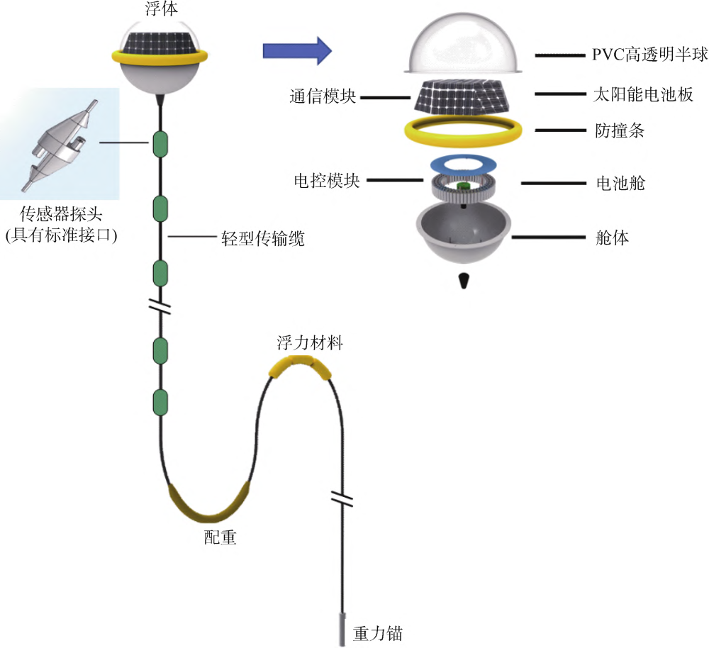 2.2物联网中低成本小浮子的实现 海洋牧场监测物联网中使用的低成本小浮子理念,来源于海洋观测中常用的漂流浮标。其体积小、重量轻、成本低、布放简单,没有庞大复杂的锚系系统,浮标下挂水帆,随海流以拉格郎日法测量海水表层流和进行大面积海区、洋面水文气象观测。它依靠Argos卫星通信网定位并上传收集观测到的各种参数,经地面接收站处理,提供给用户[5-7]。目前国内外漂流浮标大都仅关注表层温度、流速参数的测量,工作模式单一,仍然存在高精度传感器价格昂贵、依赖进口的状况,单温测量要素的浮子售价在万元左右,多水文气象要素的漂流浮标的造价将增加到4万元以上,甚至达到20万元,这成为阻碍浮标大规模布放应用的重要问题。那么,未来海洋牧场物联网小浮子是借鉴传统表面漂流浮标的结构特点,优化其电源、智能通信与控制以及传感器链挂接结构、接口,可搭载传感器链在海洋环境下长期运行。同时采用环境友好型材料,并将成本控制在人民币5000元左右,作为一种面向海洋物联网的新型通用小浮子观测平台,如图4所示。
