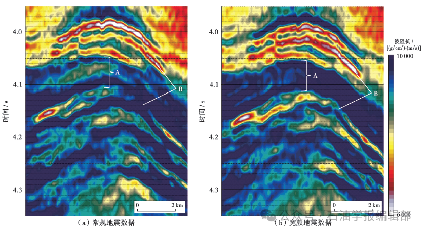 Frequency band composition of seismic inversion results 图5展示的是宽频地震数据反演结果与常规地震数据反演结果的对比,从中可以看出:①宽频资料反演对厚层地层预测更加准确,如在图5中标识A处,常规地震资料反演结果中出现了隔夹层现象,而宽频地震资料反演结果中则显示为厚层泥岩,且钻后结果也证实其为厚度达80余米的泥岩;②地震频带的拓宽使得地震资料精度显著提高,细节更加清晰,如在图5中标识B处,基于宽频地震资料反演结果的边界更加清晰,储层连续性更好,对薄层的识别能力更强。 图5 常规地震数据与宽频地震数据反演结果比较