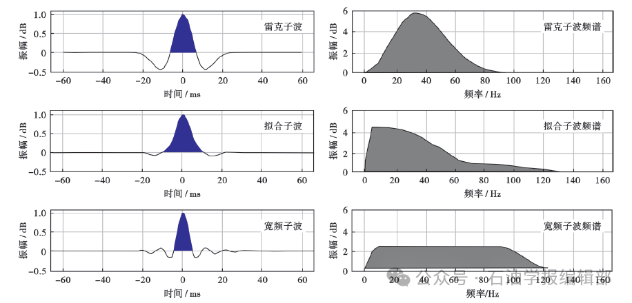 / a/ j, e! L7 x" L6 f u Seismic wavelet received by horizontal streamer acquisition 经宽频采集和处理后,宽频地震数据的子波旁瓣能量明显得到压制,一次波能量得到增强,子波形态和频带范围与常规地震数据反演的子波有明显的不同(图2)。从图2可以看出,在宽频地震数据中,子波的旁瓣已经得到明显压制,频谱宽度有了较为明显的拓宽,特别是低频端有了较好的补偿。子波特征的变化将对宽频地震数据的反演、属性分析和解释等产生较大影响,甚至会带来计算流程的改变。 图2 雷克子波、拟合子波和宽频子波比较
