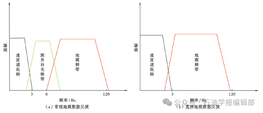8 Z" B# w# @1 K) ?( R 3.1 基于宽频地震数据的反演技术 通过地震反演补充地震资料中缺失的6~8 Hz以下的低频信息是业界广泛应用的储层预测技术[44]。深水区在勘探阶段的钻井数量较少,地层的压实趋势随水深变化剧烈,在地震反演过程中难以建立稳定、可靠的低频模型,这给地震反演工作带来了很大的挑战。宽频地震数据中的低频信息约可以达到3 Hz,利用好低频信息可有效地降低反演过程中对钻井数据的依赖[45]。业界对于如何应用宽频地震数据进行反演也有过一些尝试,例如:利用宽频地震数据的频宽优势,通过分频迭代获取不同频段范围内的反演结果,可提高对薄储层的刻画精度[46];此外,还可以通过在地震资料处理过程中的层析速度反演、全波形反演等技术获取高精度速度场,并以此为基础构建波阻抗反演的低频模型,结合宽频地震数据自身的优势,降低地震反演过程中对钻井资料的依赖,提高预测结果的可靠性。与常规地震资料反演结果相比,在宽频地震数据的反演结果中,频率构成会发生显著变化(图4)。基于宽频地震数据的反演技术省去了常规地震反演过程中井控插值构建低频模型的过程,可以大大降低横向预测结果的多解性,也可以充分发挥宽频地震数据在纵向分辨率上的优势。 图4 地震数据反演结果的频带组成 d2 ?+ U3 G2 Z* k4 C