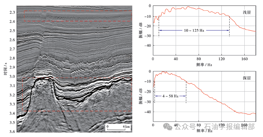 Hz,地震数据的能量主要集中在5~30 Hz。在宽频数据中,深层的能量主要集中在低频端,这使得大套地层的地震反射层次清楚,强阻抗界面的振幅强,内部地层的高频响应显得很弱。目前,很多勘探目的层系都集中在中—深层,但宽频地震资料所呈现的中—深层以低频信息占优、高频信息不足的特点使得地震剖面的“视分辨率”降低,反射界面不突出,由此给传统基于振幅信息开展构造解释、沉积储层刻画的技术带来了新的挑战。 * t! M3 \* b5 \5 N, w