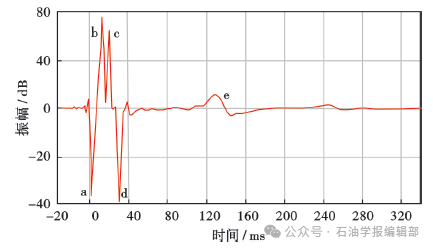 2.1 海洋宽频地震数据子波特征 在海洋地震采集过程中,采集的地震信号受震源气泡、震源鬼波、电缆鬼波等多重因素影响[1-3]。图1所示为海洋水平拖缆采集地震信号的远场子波,其中包含一次波、震源鬼波、电缆鬼波、震源和电缆混合子波,以及震源气泡。宽频采集、处理的目的是为了让地震资料仅保留与真实地层反射相关的一次波。 注:a—一次波;b—震源鬼波;c—电缆鬼波;d—震源和电缆混合子波;e—震源气泡。图1 水平拖缆采集接收到的地震子波