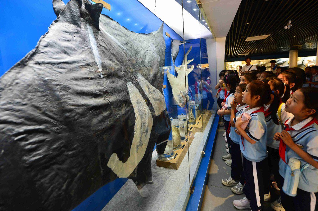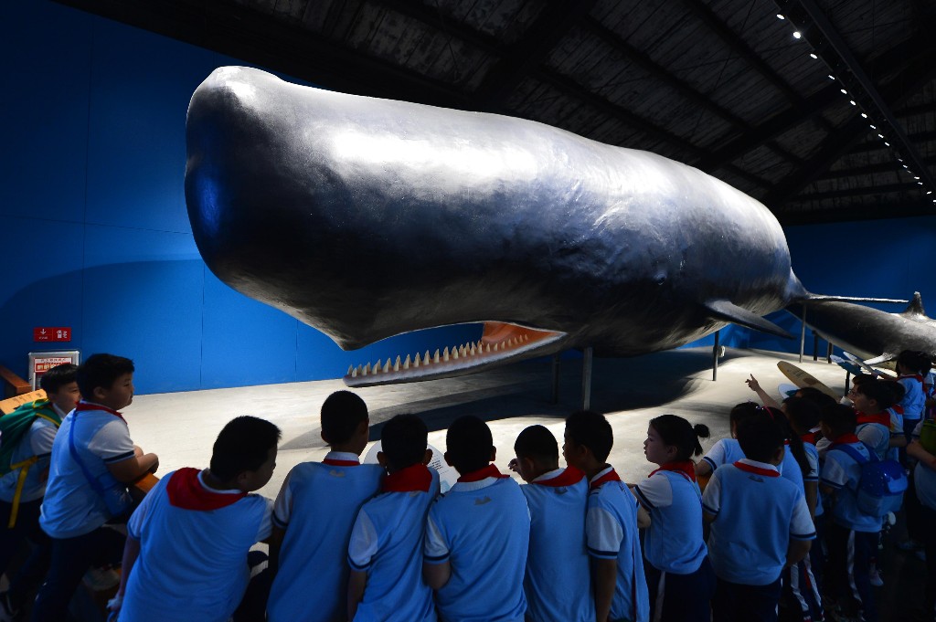 5月16日,山东省青岛市市北区嘉定路小学的学生研学青岛海底世界海洋生物馆,探索海洋生物的奇妙。图为学生在观看抹香鲸鱼皮制作的标本。王海滨 摄