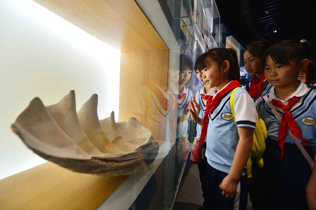 " u' T) M. k6 y0 W 5月16日,山东省青岛市市北区嘉定路小学的学生研学青岛海底世界海洋生物馆,学生们在观看大砗磲标本。王海滨 摄 2 v, O4 c* p* x; Y! l; f- p