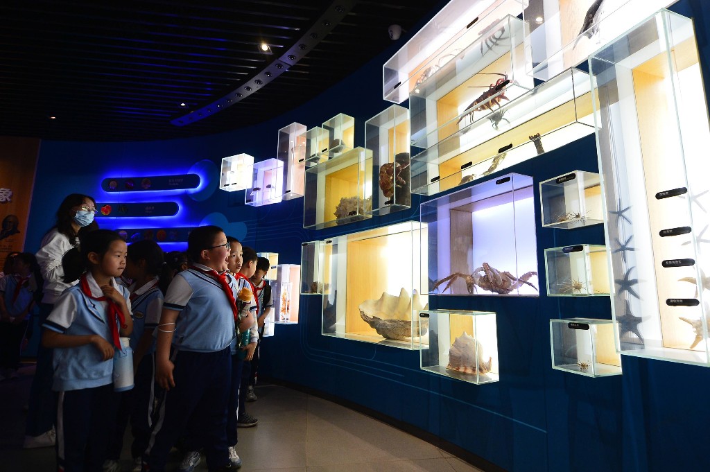 5月16日,山东省青岛市市北区嘉定路小学的学生研学青岛海底世界海洋生物馆,老师为学生科普各种海洋生物标本。王海滨 摄