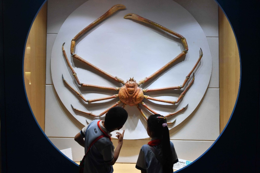 5月16日,山东省青岛市市北区嘉定路小学的学生研学青岛海底世界海洋生物馆,两名学生在观看巨螯蟹标本。王海滨 摄