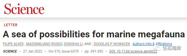 ( @. N+ X! l; p; m$ } 此外,必须大幅减少直接渔获物(包括割鲨鱼鳍,但不包括非濒危的硬骨鱼类、头足类和原住民的生计)。为减少副渔获物,捕鱼应限制在选择性或传统的渔具上,并应尽量减少在工业化渔业中使用网具。为避免产生海洋垃圾并防止垃圾进入海洋环境,应禁止使用一次性塑料制品。应修订国际法律,以促进负责任的、包容性的和以社区为基础的旅游,并促进公海的充分监督。这些可行和有效的缓解措施与世界领导人宣布的前所未有的承诺和责任相一致。 作者丨Filipe Alves(一作&通讯),Massimiliano Rosso,李松海,Douglas P. Nowacek,2022-1-27发表于Science的letter板块。编译丨EcoTrends-END-; y& m/ Y9 v4 @. p7 t" a