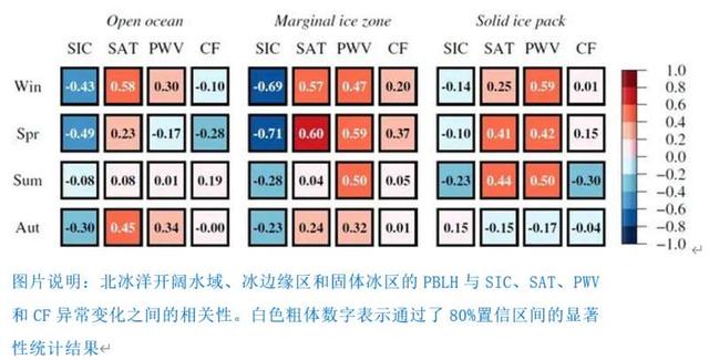 研究团队进一步结合大气红外探测卫星(AIRS)获取的北极大气边界层内的地表气温(SAT)、大气可降水汽含量(PWV)和云量(CF)等结果,分析了北冰洋不同海冰状态下大气边界层高度与北极地表气象条件的关联。结果发现,北冰洋上空大气边界层高度与地表气温和大气可降水汽含量始终呈正相关,但其对变化的响应随各季节北冰洋海冰条件的变化而变化。 _ U; Y# N" o# ]& {- E7 {