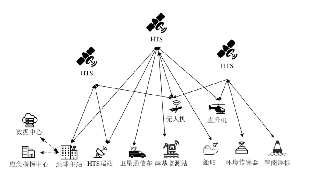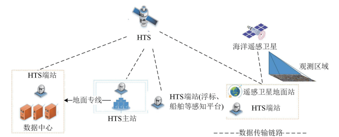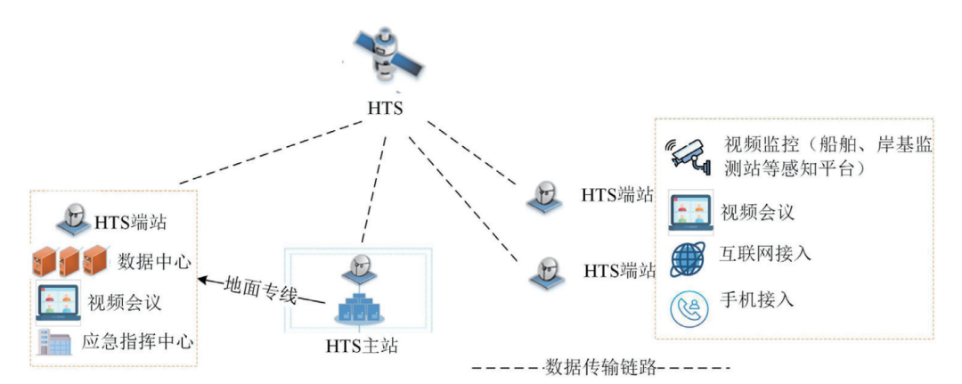 当前,卫星通信是我国海洋通信网络的主要通信方式,常用的海事卫星通信手段能够满足小数据量窄带传输需求,但存在时空覆盖范围不足,稳定性差,数据传输与处理能力有限等短板,无法更好满足智能终端获取的高清图像、视频的高速回传及实时在线监测等更高的海洋通信需求。高通量卫星(HTS)具有大带宽、组网方式灵活、按需使用带宽的特性,可支撑海洋环境监测大数据实时、高速回传与应急通信需求。