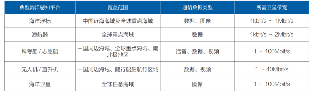 ( {% y& X: H+ ~ 海洋环境大数据获取技术取得新的突破,智能化终端持续迭代,海洋环境数据获取呈现出海量级、实时、自动化等趋势,促使海洋环境大数据回传与海洋通信需求迅速增长。当前传统的大波束通信卫星C和Ku频段资源有限、传输速率不高,海事卫星、北斗卫星、天通卫星等窄带卫星传输速率低,亟需实时、高效、大带宽的海洋信息通信系统为此提供更多的支撑。海洋环境监测通信需求主要有以下几个方面: 3 K( K- r5 a! `; P, a2 ]( H* l# B