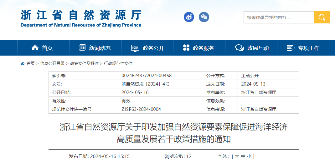 5月16日,浙江省自然资源厅发布《关于印发加强自然资源要素保障促进海洋经济高质量发展若干政策措施的通知》(以下简称《通知》)。《通知》提出强化规划引领、统筹指标计划、优化审批服务、促进节约集约和加强监管保护等5方面内容,共计12条举措。 - P E+ C; \% x' d, b. S, m