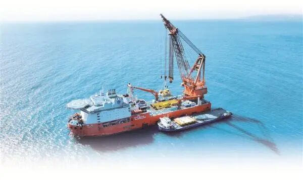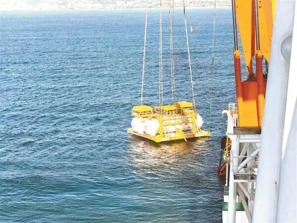 A6 \) {* Y' @7 q" L. g7 u7 P 海底数据中心一期工程最后一个数据舱模块正在吊装下水