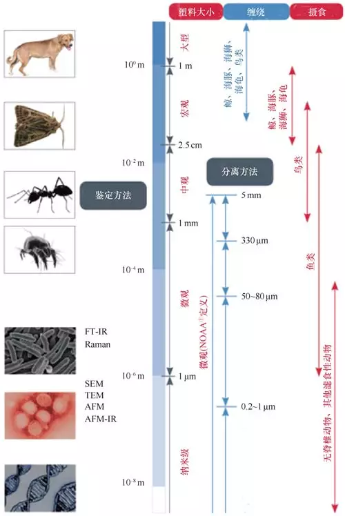 9 f* a' Y t, K# S3 Z& q) i, R ▲海洋环境中塑料尺寸范围及与生物大小的比较