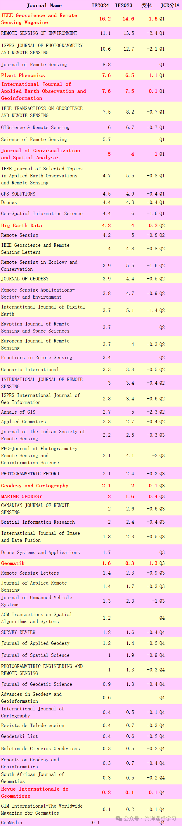 ' C1 ]' Y9 S, v3 O/ _9 ] 遥感测绘、海洋科学以及综合性地学领域的期刊普遍面临影响因子的下降趋势。据统计,约有95%的期刊在最新的评估周期内经历了影响因子的下降,显示出科研出版领域的一种显著变化。例如,知名的《IEEE Transactions on Geoscience and Remote Sensing》(IEEE TGRS)的影响因子从8.2下降至7.5,而大地测量著名期刊《Journal of Geodesy》也从4.4降至3.9。 4 f n! ]/ ?- U4 ^