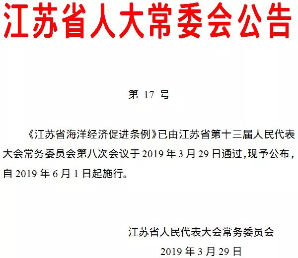 : e4 T2 _+ I% m! | 《江苏省海洋经济促进条例》于3月29日经江苏省十三届人大常委会第八次会议审议通过,将于6月1日起正式施行。