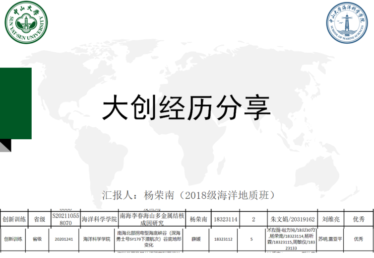 7 ]0 o- j# C" e f1 s) X' U' H% X 接下来,2018级海洋地质杨荣南同学作为往年优秀大创项目负责人代表,从如何进行项目管理、如何规划大创时间和学业时间、大创中遇到过的困难和解决办法、大创收获体会四个方面进行了经验分享。 , }" \& E" _6 X g3 l
