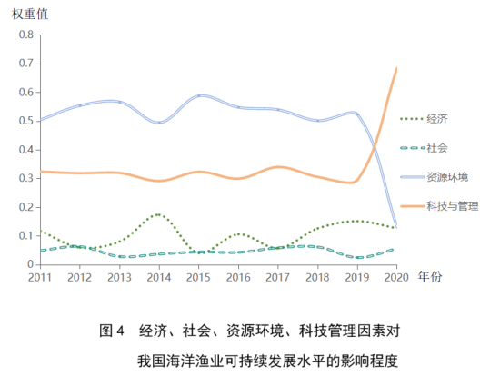 本文在评估我国海洋渔业可持续发展水平基础上,利用熵权法计算得到的权重值,进一步分析影响我国海洋渔业可持续发展水平的主要因素,结果可为进一步提高我国海洋渔业可持续发展水平提供数据参考。2011-2020年期间,经济、社会、资源环境、科技与管理因素对我国海洋渔业可持续发展水平的影响程度如图4所示。999由图4可知,2011-2019年期间,资源环境因素权重值保持在0.5-0.6之间,科技管理因素权重值在0.3左右,经济因素权重值在0.05-0.15之间波动,社会因素权重值维持在0.05左右。上述结果表明,资源环境质量改善对我国海洋渔业可持续发展具有显著影响作用,科技管理因素对渔业可持续发展具有积极作用,经济和社会因素的影响相对小一些。重视海洋资源消耗和环境污染问题,保护和修复海洋生态系统,可改善渔业发展环境,提高科技技术应用水平和海洋管理水平可促进海洋渔业可持续发展。值得说明的是,2020年资源环境和科技管理因素的权重值发生了巨大变化,可能与2019年底疫情发生后资源环境和科技管理数据变动相关,因为只涉及单一年份的数值变动,并不能排除其他因素影响,在今后的研究中,随着时间序列数据的更新,应注意分析这两个因素的趋势变化情况。 3 \4 }# R# `2 M" I