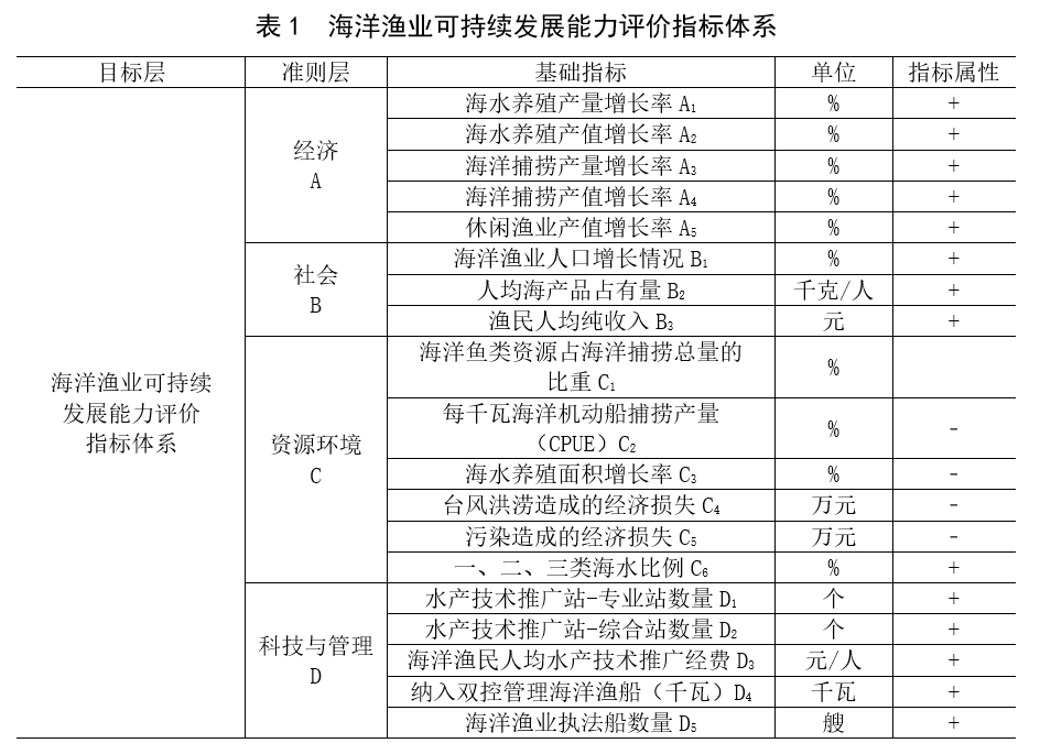 1 w9 [/ z) A6 D$ u: @ 近年来人口扩增和陆域资源枯竭加剧,海洋渔业在需求和政策的推动下得到了飞速发展,在为我国居民提供粮食资源和优质蛋白方面起到了举足轻重的作用,但是由于长期以来粗放式的发展模式,传统海洋渔业面临渔业资源枯竭与近海空间资源紧缺的困境而呈现增长乏力的局面,而评价我国海洋渔业可持续发展水平有助于了解我国海洋渔业发展状况,对于制定宏观政策和管理海洋渔业生产具有指导性的作用。本研究遵循科学性、全面性、代表性、独立性、可操作性和数据可获性的指标体系构建原则,经实际调查分析和专家咨询,从经济、社会、资源环境和科技管理4个角度,构建了我国海洋渔业可持续发展水平评价指标体系,详见表1。由表1可知,评价指标体系包括1个目标、4个准则和19个指标。