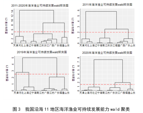 为更好分析我国海洋渔业可持续发展能力随时间变化的趋势,对比各沿海地区海洋渔业可持续发展能力之间的差异,将沿海11地区海洋渔业可持续发展能力划分为“高水平”“中等水平”和“中低水平”三个层级,绘制研究期内各地区海洋渔业可持续发展水平wald聚类图,并分别与2011年(第一年)、2019年和2020年(最近的两年)聚类图进行对比(图3),图上的每条红色虚线都截断了三条直线,每一条直线下面对应的地区就属于同一个聚类。