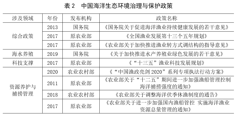 1 i! Y. x; D3 e# r/ g! Y. o 2011-2020年,我国在促进海洋渔业可持续发展方面做出了很多尝试和努力,国家发布了引导和规范渔业健康发展的多种政策(见表2),包括《国务院关于促进海洋渔业持续健康发展的若干意见》《“十三五”渔业科技发展规划》《全国渔业发展第十三个五年规划》等。这些政策聚焦提升科技支撑能力和贡献率;发展绿色健康的海水养殖业,加强质量安全监管和疫病防控;养护渔业资源,实施海洋伏季休渔和海洋捕捞渔船控制制度等。 $ K# j' x7 J) `( e