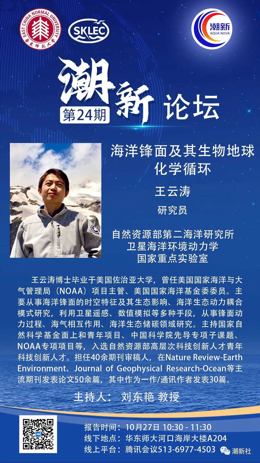 : }8 K4 k2 h1 T: s# R1 J& P& B “潮新论坛”第24期将于10月27日10:30-11:30在线上举行。本期邀请到自然资源部第二海洋研究所卫星海洋环境动力学国家重点实验室王云涛研究员 D3 d2 e* R/ F4 F+ u# S