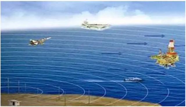 地波雷达雷达发射机发射电磁波,工作频率为3~30MHz,此频段的电磁波能够沿着海面绕射传播,遇到目标后部分散射的能量朝向雷达接收部分发射,接收天线搜集到这部分散射的电磁能后,经过传输线反馈给接收机。信号处理机对天线接收到的信号进行处理,并提取出目标信息,实现超视距探测。