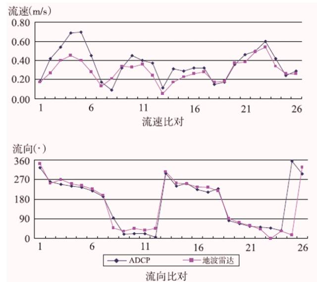 对比测量采用的常规测量仪器和手段,依据相关国家规范,对相同海域进行表层海流测量。仪器采用声学多普勒流速剖面仪(ADCP)是国际先进的声学自容式海流观测仪器,精度高、数据无偏移,采用声学多普勒效应原理,可以定时、定层分别测定各层海水流速流向,广泛应用于浅水海洋研究(水深小于100m),港口监测,河流、湖泊和渠道等的科学研究等领域。