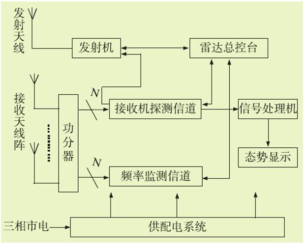 8 u- z- V' p a2 [( r9 g6 T 地波雷达系统包括指向海洋方向的发射天线、一组接收天线阵以及确保系统运行配套的软件和硬件,图1给出了高频地波雷达的系统结构。该雷达为全相参系统,主要由以下几部分构成:发射机及发射天线、接收机及接收天线、信号处理机、态势显示器、频谱监测系统及雷达总控台。