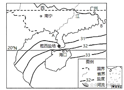 海洋为人们提供了丰富的食物和资源。雷州半岛处于中国大陆最南端,半岛的西南部的苞西盘场为广东省重要的海盐生产基地之一。6一9月为该盐场晒盐的黄金季节,此时盛行东南风。下图示意雷州半岛及其周边海域近海表层8月盐度(%)分布,分析苞西盐场有利于晒盐的自然条件。 9 p8 B2 K! i' v6 ^. p