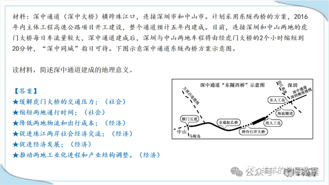 & M; Z$ |' D$ ^' O' B6 d, C& P& R 深中通道(深中大桥)横跨珠江口,连接深圳市和中山市。计划采用东隧西桥的方案,2016年内主体工程高速公路项目开工建设,整个通道预计五年内建成。目前,连接深圳和中山两地的虎门大桥每日车流量较大,深中通道建成后,深圳与中山两地车程将由经虎门大桥的2个小时缩短到 20分钟,“深中同城”指日可待。下图示意深中通道东隧西桥方案示意图。读材料,简述深中通道建成的地理意义。 + I: ^$ r }9 ^