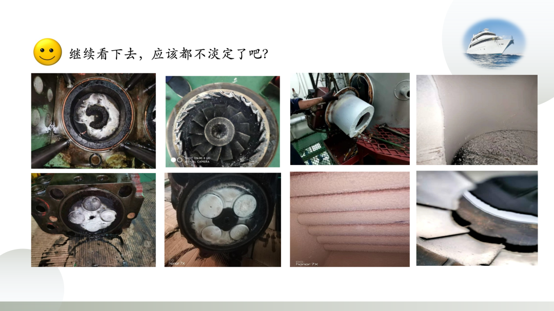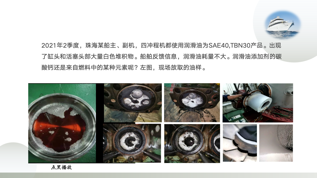 2021年2季度,珠海某船主、副机,四冲程机都使用润滑油为SAE40,TBN30产品。出现了缸头和活塞头部大量白色堆积物。船舶反馈信息,润滑油耗量不大。润滑油添加剂的碳酸钙还是来自燃料中的某种元素呢?左图,现场放取的油样。 1